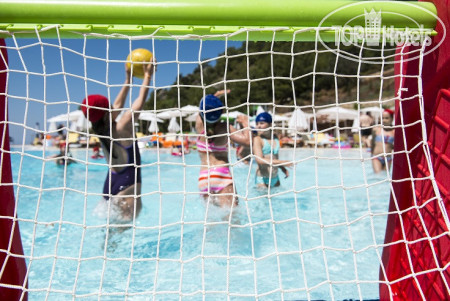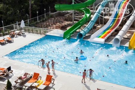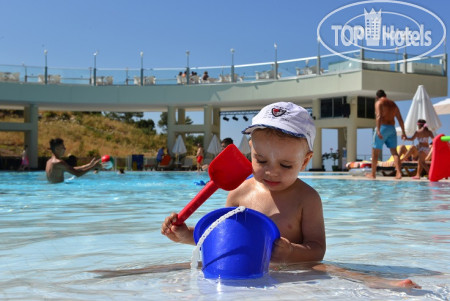 Бассейн большой, рано с утра британцы занимают места на лежаках, поэтому днем занять место фактически нереально. Вода чистая, бассейн не глубокий - полтора метра. Еще есть 4 водные горки чуть ниже, они больше для детей подходят.