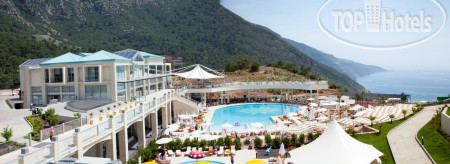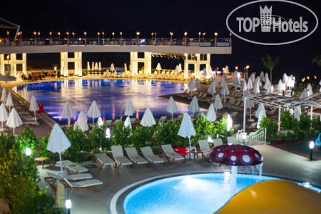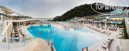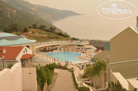 От аэропорта Даламан примерно 60 км - на автобусе ехали примерно 1 час 20 минут по шоссе с преимущественно горной местностью. Отель реально расположен на 3-й линии - до моря километра 3. Рядом расположен еще один отель и станция канатной дороги на гору Бабадаг. Территория отеля не большая, расположен прямо на склоне горы. Сразу скажу, что тем, кто привык отдыхать в пафосных и шикарных отелях Антальи, по началу может быть очень непривычно или даже чуть-чуть не по себе. Хоть и позиционируют себя как 5 звезд, то это совсем не те 5 звезд, в которые вы привыкли приезжать. Тут нужно много передвигаться: если хотите на море - нужно ехать, в аквапарк - нужно ехать, в ближайший населенный пункт - тоже, даже если у вас номер на самом верху - нужно прилично подняться.