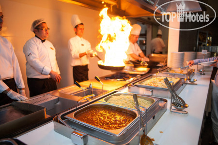 Питание. Вкусное, за все 10 дней отдыха не было чего-то такого, что взял - и не захотел съесть. Из интересного - раза 2 давали лосось на гриле и тунец. Креветки и мидии были только в виде "морского коктейля" несколько раз, для добавления в салат. Что выделяется - всегда много разных сыров, по утрам иногда кладут с плесенью. Их фруктов ел арбузы и дыни, спелые, были еще другие фрукты: бананы, сливы, виноград, грейпфрут, яблоки, это ничего не пробовал.