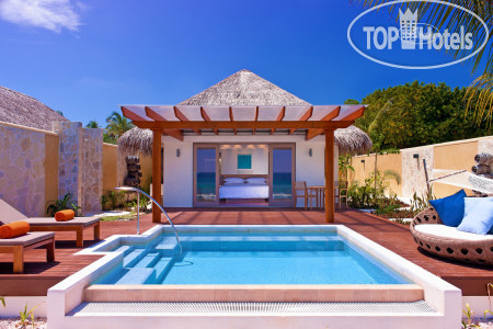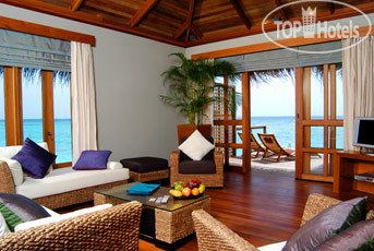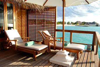По приезду на остров, на причале вас встречают сотрудники отеля, сажают вас на электрокар и везут на ресепшен, оформляют документы а потом проводят обзорную экскурсию по острову. Всё показывают, всё рассказывают. Персонал отеля расторопный, доброжелательный и профессиональный. За время пребывания в отеле мы встретили минимум четверых русскоговорящих сотрудников, так что проблем с коммуникацией не было никаких. За то время пока вас катают по острову чемоданы уже доставят в номер. У нас было бунгало на воде без бассейна, расположенное на западном, противоположном от СПА конце острова. Сразу скажу, что нам очень повезло с номером. По нашим оценкам это самая тихая локация. Чем ближе к восточному концу острова, тем больше волн и шума от них.