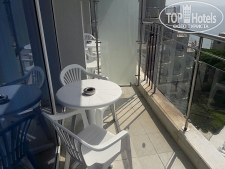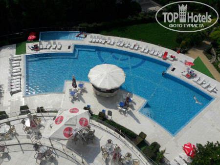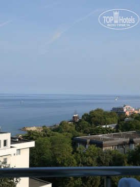 Здание и территория. Отель расположен на второй линии, въезд находится на оживленной трассе недалеко от Варны. Наш номер выходил окнами на море, с 7 го этажа открывается хороший вид, хотя и впереди стоящее здание хочется пдвинуть.Территория отеля вполне себе симпатичная. Ландшафтным дизайном, правда, никто не занимался, да и негде, т.к. места очень мало. На снимках отеля с дальней перспективы, Вы видите бассейн и небольшую лужайку перед ним-это вся территория отеля. Нам гулять некогда было, вечером ходили к морю, особой необходимости в ботаническом саду на территории не почувствовали.