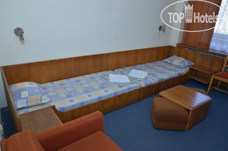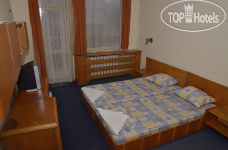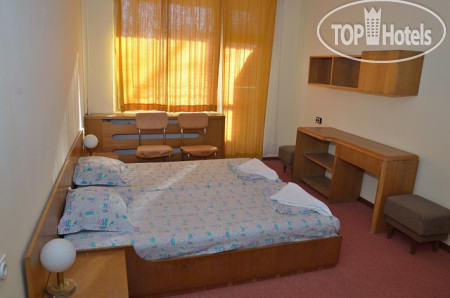 Мебель тех же времен, старая НО вполне пригодная для обихода, столик, телевизор с русскими каналами(тв не работал поменяли сразу же без проблем) встроенный шкаф, лично для нас главным неудобством была кровать, а точнее две Сдвинутые рядом две кровати, меж которых образовывался проем который мы ликвидировали одним (из двух) одеял. Из ванных принадлежностей были единоразово положены 2кусочка (крошечных) мыла и таких же маленьких пузырька шампуня, так что берите с собой, бумага регулярно добавлялась. Полотенца-были чистые, большие 2шт, не меняли (мы не просили, обходились своими).
