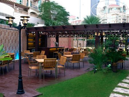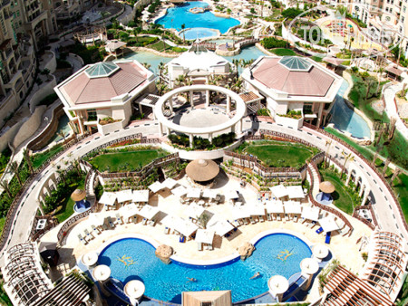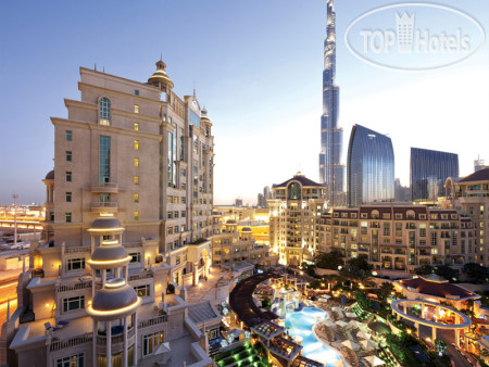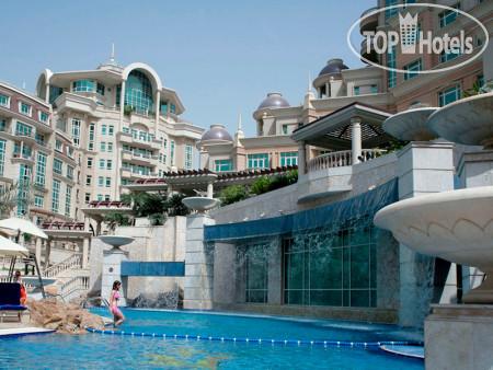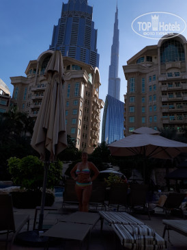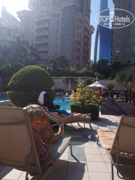 Мы жили в основном корпусе, но у отеля много различных корпусов, расположенных в форме прямоугольника и с каждого корпуса есть выход на улицу. Внутри двора, которые образуют эти корпуса огромная зеленая территория, где простирается очень красивый сад, повсюду зелень, цветы, различные деревья, множество дорожек и беседок, а также бассейны. Уж не многие городские отели Дубая могут похвастаться такой огромной территорией. Есть детская площадка с различными качелями, и вечерами там полно детишек. Бурдж Халифой можно любоваться, как и в бассейне, так и лежа на шезлонге. Шезлонгов предостаточно, все в отличном состоянии. Полотенца выдают около маленького бассейна, и да он очень глубокий, а вот у большого бассейна есть плавный заход в воду.