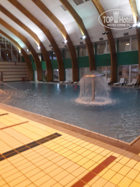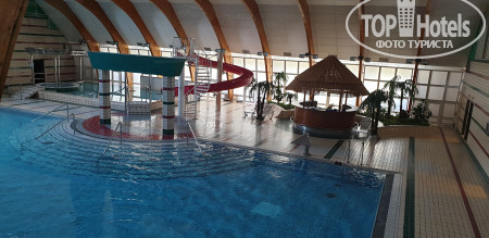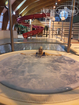 6. Отдельно про бассейн. В аквазоне наряду с большим бассейном (темп.воды 28 градусов) имеется детский лягушатник (вода 30 градусов) и джакузи (вода 35 градусов), а также две финские сауны. Небольшая водная горка в детской зоне не работает. NB! В бассейн детям требуется справка и всем купальщикам шапочки для плавания! Если шапочку с собой не привёз, можно купить её там же на месте или взять п/э шапочку для душа из номера. Условие вроде бы не хитрое, но за три дня частого плавания в бассейне (при этом в бассейне одновременно находилось от 15 до 25 человек) ни одного волоса никто из нашей семьи так и не увидел в воде! Так что однозначно респект тем, кто это правило ввёл! )) А вот работает спорткомплекс (и, соответственно, бассейн) не очень удобно - с 10 утра до 21-22 часов ( в 21:10 перестают пускать в бассейн и начинают фактически работать только "на выход"). Из-за этого утром сразу после открытия (примерно с 10:15) в бассейне куча народа и так весь день. Лучше бы сделать начало работы пораньше, с 8:00 в идеале, или, хотя бы, с 9:00. Ведь завтрак с 8:30, а медцентр вообще в 8:00 открывается... Более раннее открытие бассейна помогло бы немного минимизировать толпу желающих поплавать, распределить её по времени более равномерно.