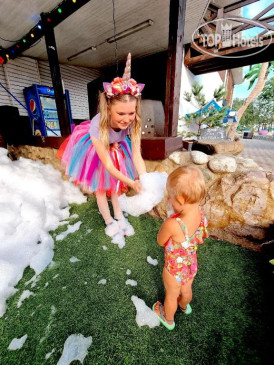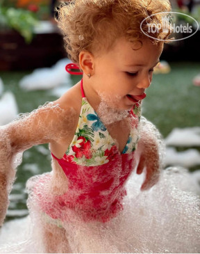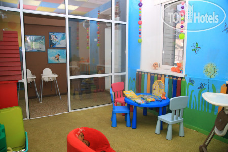 Территория: красивая, но очень небольшая, можно всю обойти за 10-15 минут. Есть открытый волновой бассейн (летом). Имеются качели, горки, какие то лазилки - дети точно найдут чем заняться.