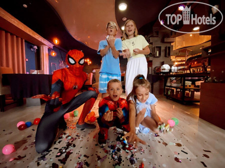 Ужинали мы также в этом же ресторане на территории отеля, ассортимент меню достойный, есть две игровые комнаты для деток. В выходные проводится развлекательная программа, в воскресение вечером мы ужинали под кинопоказ. Дочке преподнесли в день рождения десерт со свечкой и открыткой, очень приятный знак внимания.