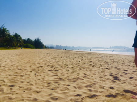Пляж находится через достаточно оживленную дорогу. Лежаков нет. Думаю это из за того, что ориентирован он на китайцев, а китайцы как я посмотрела не лежат на лежаках, не загорают, да что там - купаться даже не ходят, а просто сидят под своими зонтами около моря или фотографируются. Я пользовалась полотенцем из номера и ходила на пляж в халате. Утром и днём солнце очень хорошо печёт, а вот после 15:00 мне было достаточно прохладно заходить в море, поэтому просто лежала и загорала. На пляже ходят женщины и предлагают нарезанные фрукты, к концу дня их лучше не брать, за целый день они успевают немного подпортиться. Брала манго за 8 юаней. Блох на пляже (как пишут) не наблюдала, были только маленькие мошки, укусы от которых проявились и очень чесались уже в России на третий день после приезда.