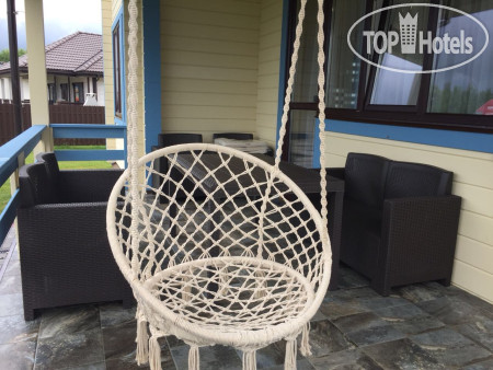 Приятно оформлены не только интерьеры домиков, но и веранды, на которых установлены комфортные кресла и диванчики с мягкими подушками, дополненные небольшим столиком.