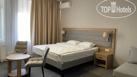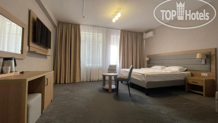 Сам номер очень просторный, я бы сказала пустой! Постороннего запаха нет и это очень радует! Две односпальные кровати, удобные матрасы и чистое, цветное белье. Кондиционер, две прикроватные тумбочки, в противоположном конце номера, а он приблизительно 18 м кв., находится журнальный столик и два табурета! В наличии графин/кувшин для воды и два стакана! Мебель свежая, как и постельное белье! На окнах шторы ночные и тюль, которую прожгли, по всей видимости, гости отеля (хотя в номерах курить запрещено).