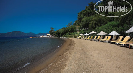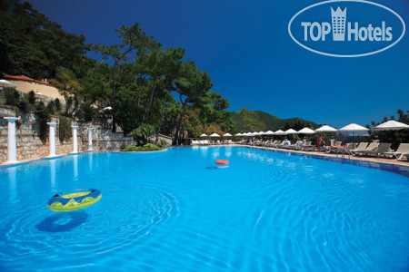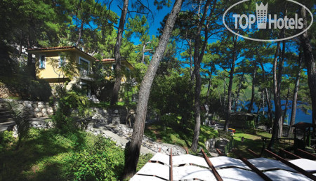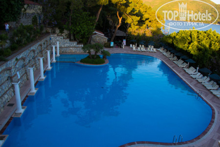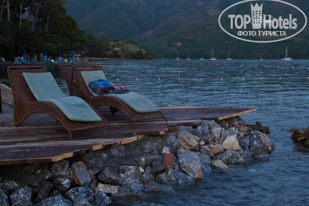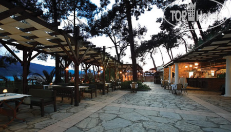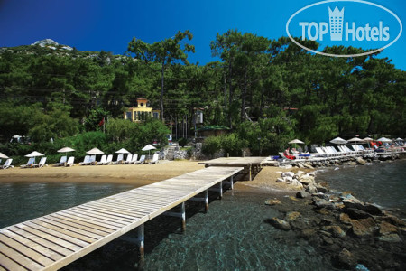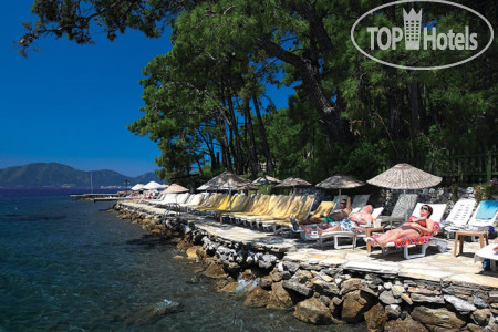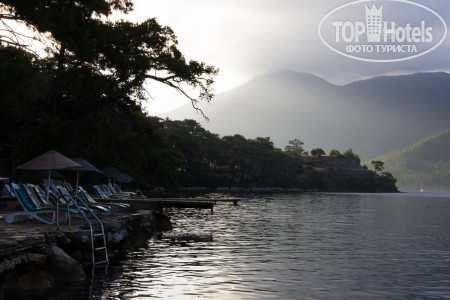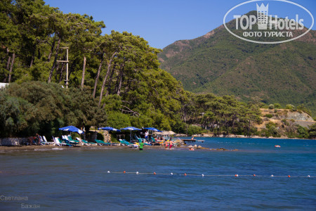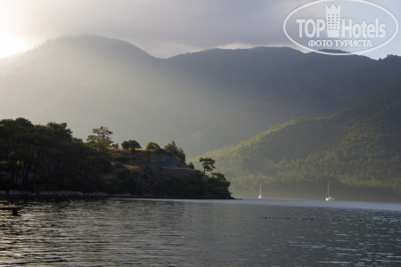 Отель расположен в сосновом лесу, в 7 км. от Мармариса. Очень красивая бухта, напротив отеля остров, видна марина с яхтами. Изумительные пейзажи. На это с женой и польстились.