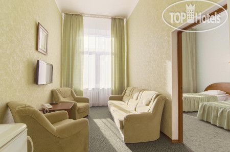 2. На две отдельные кровати- всего одна прикроватная тумбочка и одна настольная лампа. В номере как бы две комнаты- прихожая с диваном и телевизором и спальня, естественно, без телевизора.