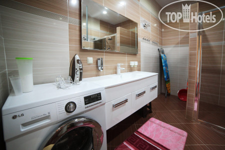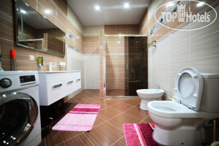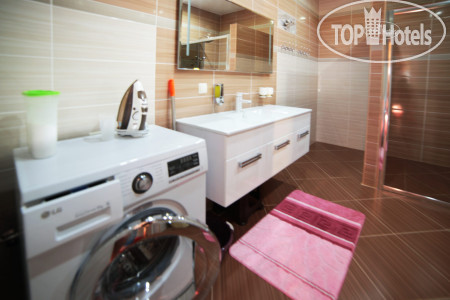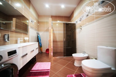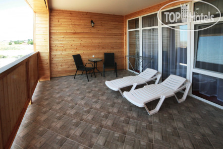 - Номера - мы брали номера Комфорт, поэтому говорю за них - 2 больших комнаты, в каждой кондиционер и телевизор, очень большой санузел - там огромная душевая кабина, раковина, унитаз, биде, стиральная машина, утюг, фен. У нас был номер со своей большой террасой с лежаками, столиком и стульями, плюс сушилка для белья. Все чистенько, уютно, претензий нет. Дают комплект полотенец для номера, большие полотенца для бассейна (на пляж и на процедуры их брать нельзя - имейте это ввиду), одно покрывало на семью для пляжа