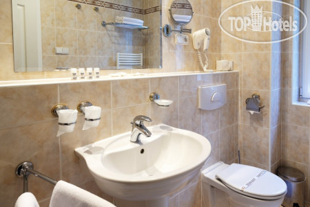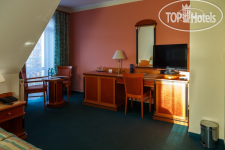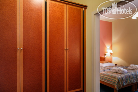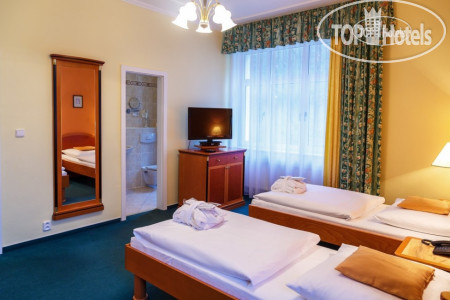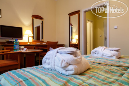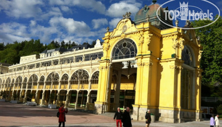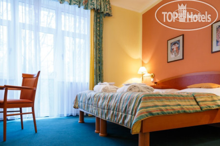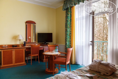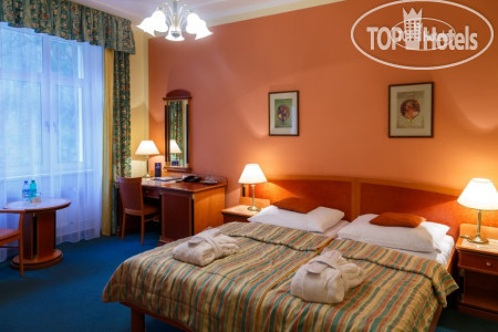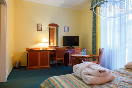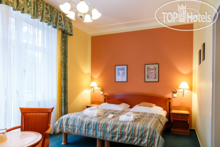 Само здание небольшое 4-х этажное (рядом стоянка для машин), симпатичное, как и все здания в Марианских Лазнях, в нем же находится бальнеоцентр и сауна. Номера чистые, просторные, имеется все необходимое – два встроенных шкафа с большим количеством вешалок (там же швейный набор, щетка для обуви и одежды), сейф, несколько зеркал - есть и в полный рост, кресло, диван, журнальный столик, встроенный холодильник, спутниковое ТВ, 2 кровати, прикроватные тумбочки и светильники. В ванной комнате - ванна, умывальник с большой полкой, стационарный фен, увеличивающее зеркало. По приезде дается 2 бутылки воды, шампунь, кондиционер, лосьон. В дальнейшем они не пополняются, можно за доп. плату. Пополняется туалетная бумага и мыло, но тоже надо напоминать. Выдаются по приезду халат и тапочки, халат меняют через неделю, но за доп.плату можно и раньше. Хороший бесплатный Wi-Fi во всем отеле.